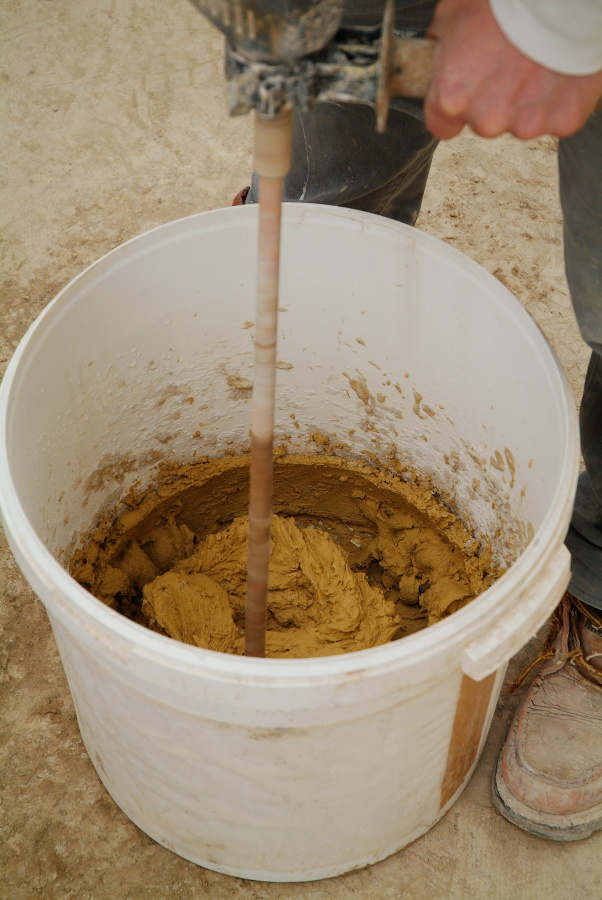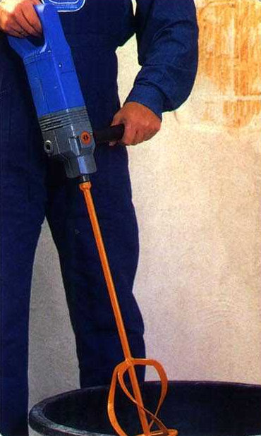 Mix 1 or 2 bags each time with an electrical blender (minimum 1 200 W or (better) 1 800 W) until a homogeneous paste is achieved without lumps. Depending on the product, you will need from 10 to 15 litres of water per bag. Put half the water in the receptacle, sprinkle on the plaster, then add the remaining water. Adjust the consistency of the paste by adding either water or plaster as required. The paste should stick to the wall in a 3cm thick layer without flowing down.