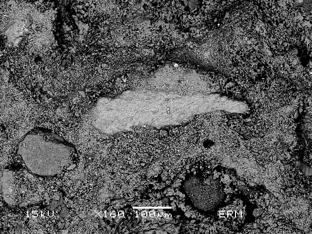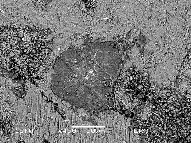 In the carbonate part, as well as in the clay part we found the same celestine crystals. They appear as the white dots on the pictures (a bit hard to see on the lower scale images).