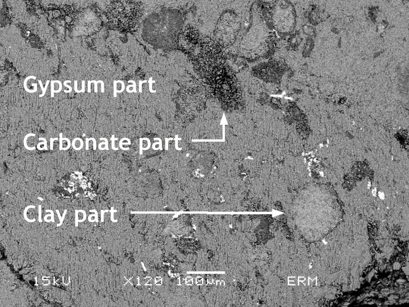 In these pictures, you can see the gypsum matrix, the carbonate parts (darker ones), and a clay part (round gray one).