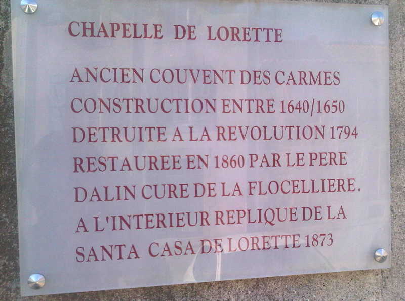 In 1617, Jacques de Maillé-Brezé, Marquis de la Flocellière promises his beloved Lady Hamilton to build a monastery for the repose of her soul. In 1640 the Carmelite Order arrived in Flocellière and the monastery was dedicated on August 15th, 1658 to Notre Dame de Lorette, where the Marquis had traveled on a pilgrimage.